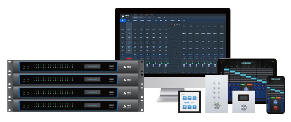 處理部分采用數字音頻處理器作為核心處理設備,所有音頻的輸入和輸出均由音頻處理器完成。它將輸入的模擬音頻信號轉換成數字信號,然后對數字信號進行一系列可調諧的算法處理,滿足改善音質、矩陣混音、消噪、消回音、消反饋、自動混音、自動增益、均衡、壓限、分頻、濾波、延時、電平控制、電平表、信號發生器等應用需求,再通過數模轉換輸出多通道的模擬信號。本項目采用12進12出音頻處理器,通過工程師一系列的調試,滿足現場比較高的聲音效果。