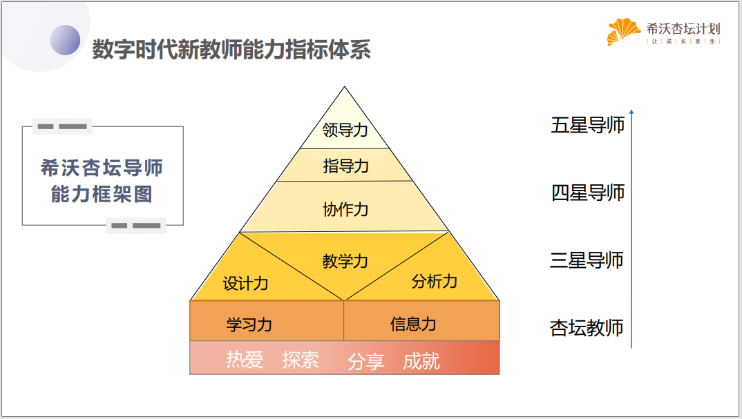 杏壇計劃是希沃旗下“以師育師”的教師專業發展計劃,通過信息化的學科融合培訓體系,助力教師專業成長。今年9月,為應對教育數字化對教師能力提出的新要求,希沃聯合華南師范大學未來教育研究中心,全新升級了杏壇計劃,更新內容包括了新認證方法、新培養標準、新能力模型、新課程資源、新發展支持五個方面。