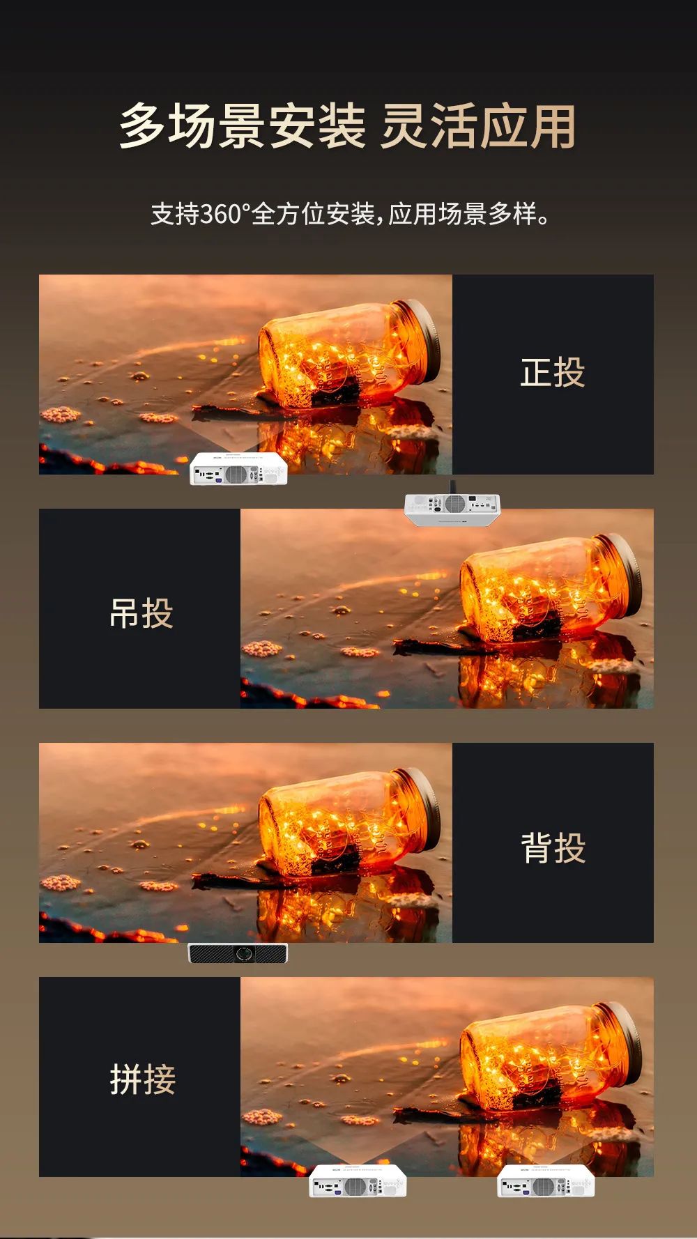 針對酒店民宿、沉浸式餐廳、足浴、劇本殺、會議辦公等娛樂休閑、文化商務領域,從實際場景以及使用需求出發,光峰科技專業研發定制推出商用激光高清投影機——AL-F400。