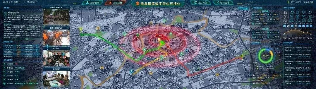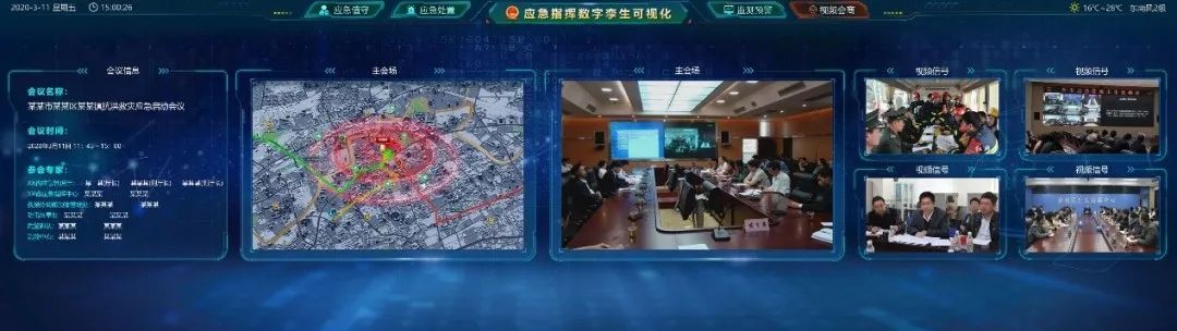 基于數字孿生城市,疊加顯示參會指揮機構、管理部門的實時地理位置,并通過電話會議、視頻會議的方式連線各參會單位,顯示視頻會議圖像和電話通訊標識,滿足應急會商需求,提升應急指揮過程中的會商溝通效率,確保會商溝通順暢。