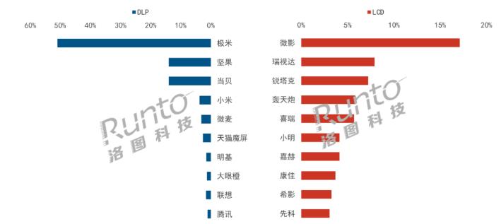 DLP市場份額下降至42%。DLP市場TOP3品牌為極米、堅果、當貝,合計份額達到79.0%,較上月上漲1.1個百分點。極米繼續保持絕對領先優勢,份額超過五成;堅果排名第二,銷量環比增長7%;當貝以極小的差距緊跟堅果位列第三,其中長焦激光產品X3快速上量,帶動銷額本月升至第二。從同比看,TOP10品牌中聯想漲幅最高;從環比看,騰訊增長最為明顯。