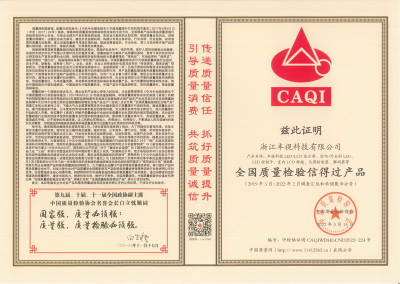 傳遞質量信任,引導質量消費。獲得來自中國質量檢驗協會的權威認可,是對豐視在質量誠信建設的不懈堅守的認可,也表明了豐視的產品質量經受得住權威機構的考察及社會的考驗。