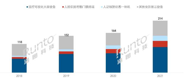 洛圖科技(RUNTO)調研數據顯示,2021年中國整體安防市場的顯示設備規模是214億元,與同期比增長31%。其中監控可視化大屏設備(LCD拼接屏、小間距LED屏)市場規模最大,占比49%;人臉識別考勤門禁設備和人證核驗訪客一體機的合并市占是22%;智慧安防中其它顯示設備占比29%。