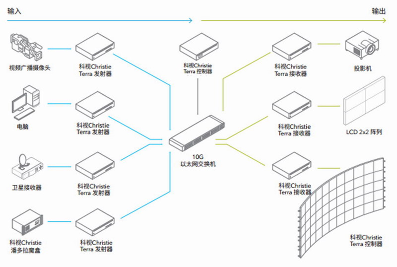 Terra 支持專業(yè)視聽項(xiàng)目中的一系列應(yīng)用,包括 AV 擴(kuò)展、AV 交換、縮放,視頻墻、多視圖、以及 KVM 應(yīng)用,這些應(yīng)用可以獨(dú)立實(shí)現(xiàn),也可以全部用于包含許多信號(hào)源和不同顯示終端的系統(tǒng)中。