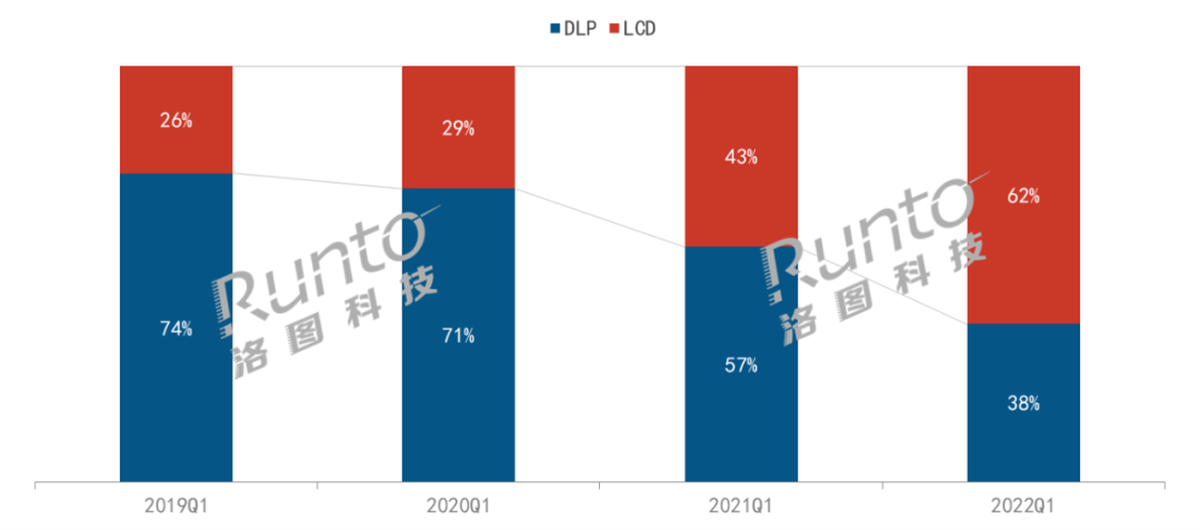 DLP技術(shù)憑借高對(duì)比度、高防塵性、高反應(yīng)速度、低成本、小體積等優(yōu)勢(shì),是智能投影的主流顯示方式。根據(jù)洛圖科技(RUNTO)線上數(shù)據(jù)顯示,2020年之前,DLP技術(shù)一直占據(jù)著市場(chǎng)65%以上的份額。由于突發(fā)的新冠肺炎疫情和緊張的國(guó)際貿(mào)易關(guān)系,全球范圍、全行業(yè)都出現(xiàn)了芯片短缺問題,智能投影行業(yè)也未能幸免,DLP技術(shù)份額不斷下降,這一現(xiàn)象持續(xù)到2022年一季度,份額降至38%。