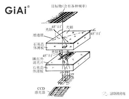 光學(xué)低通濾波器大都是由兩塊或多塊石英晶體薄板構(gòu)成的,放在CCD傳感器的前面。目標(biāo)圖像信息的光束經(jīng)過OLPF后產(chǎn)生雙折射(分為尋常光o光束和異常光e光束)。根據(jù)CCD像素尺寸的大小和總感光面積計算出抽樣截止頻率,同時也可計算出o光和e光分開的距離。改變?nèi)肷涔馐鴮纬刹铑l的目標(biāo)頻率,達(dá)到減弱或消除低頻干擾條紋的目的,特別是彩色CCD出現(xiàn)的偽彩色干擾條紋的目的。利用雙折射晶體制作光學(xué)低通濾波器,通過前置濾波,能夠有效地限制被采集圖像在光敏面上的頻譜寬度從而減小頻譜混疊。
