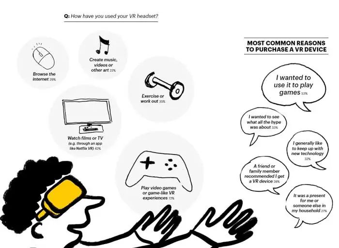 例如,每10名受訪者中有7人表示主要將VR頭顯用來玩游戲,看電影或看電視則為42%。至于其他,29%用來上網(wǎng),鍛煉或健身則為35%,創(chuàng)作音樂或視頻為22%。