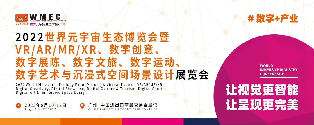 2022世界元宇宙生態博覽會暨VR/AR/MR/XR、數字創意、數字展陳、數字文旅、數字運動、數字藝術與沉浸式空間場景設計展覽會將于8月10日至8月12日在廣州中國進出口商品交易會展館B區10.2、11.2館盛大舉辦。