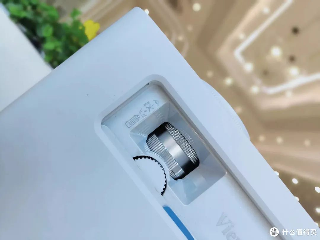 鏡頭調(diào)節(jié)不僅有常規(guī)的ZOOM+FOCUS手動(dòng)對(duì)焦,還附有一個(gè)抬高旋鈕(也就是專業(yè)高端家用投影才配置的鏡頭位移)。通過調(diào)節(jié)聚焦與變焦環(huán),可以對(duì)畫面的大小和清晰度進(jìn)行調(diào)節(jié),而白色的抬高旋鈕可讓畫面上下移動(dòng),作為畫面的微調(diào),對(duì)吊裝的客戶來說,安裝的時(shí)候特別便捷。