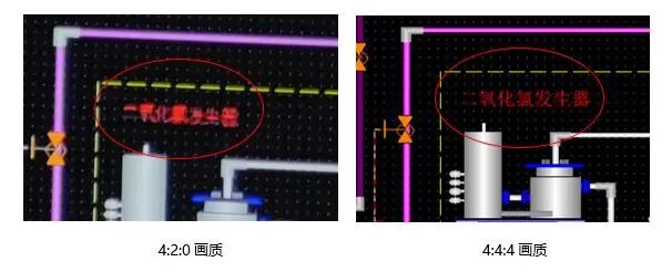 (從圖中兩種畫質的對比中可見,4:2:0文字的紅色與黑色出現(xiàn)了粘連,邊緣模糊,難以識別;而4:4:4的文字色彩過渡區(qū)域無斷層,輪廓清晰,絲毫不影響識別。)