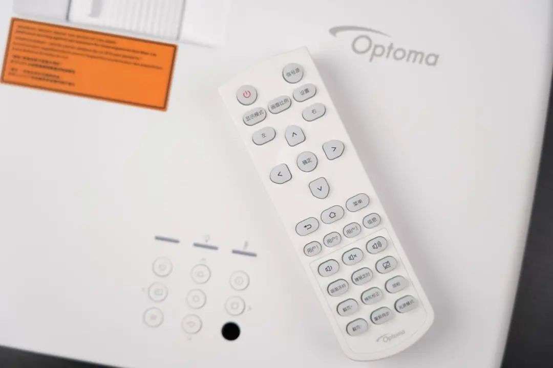 奧圖碼EL360H激光投影機的控制面板位于機身頂部,用戶能非常方便地進行“電源開關”、“梯形校正”、“音畫輸入”等常用操作。考慮到現代用戶習慣使用遙控器對設備進行操作,因此奧圖碼為配套遙控器提供了更豐富的功能,這也方便了吊裝方式的用戶更好地對設備進行控制。
