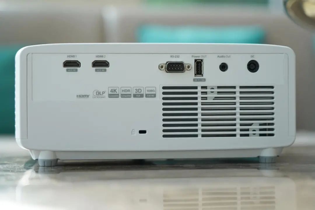 在奧圖碼EL360H激光投影機的機身背面,我們看到2枚HDMI 2.0(HDCP2.2)接口、一枚RS232接口、一枚USB Type-A(Power Out)接口、一枚3.5mm音頻接口、以及電源接口,憑借豐富拓展性可接駁不同設備帶來便捷使用體驗。
