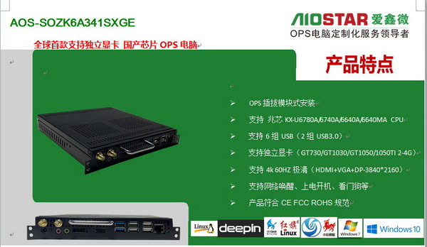國產化OPS電腦:國產CPU飛騰FT-2000/4 /兆芯KX-6000系列CPU+國產操作系統(UOS/Deepin/Kylin)系列OPS-C電腦