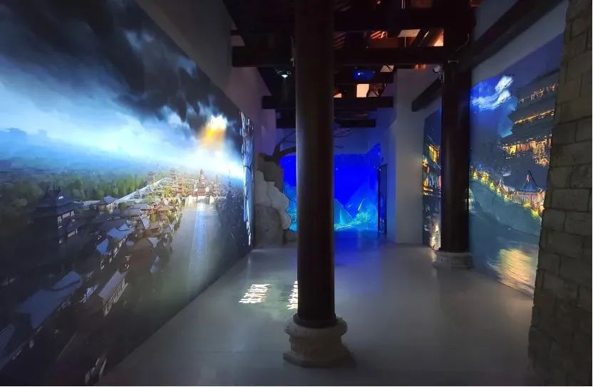 方案優勢:為體現陳子昂詩句大氣磅礴的歷史感,場館采用超短焦沉浸式方案呈現環繞立體的畫面。在通道的三邊墻體,配備T68超短焦產品進行260吋1*3的融合,畫面整體尺寸17*3m,呈現真實、生動的歷史感,畫面具有極強的沉浸感。