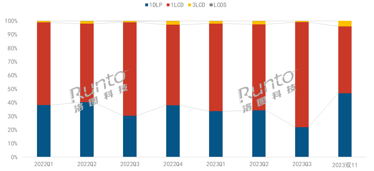 根據洛圖科技(RUNTO)線上監測數據顯示,2023年雙十一大促期間,采用激光光源(不含混光)的產品數量達到26個,銷量占比達到14.6%,較去年雙十一和2023年前三季度均高出8.1個百分點。