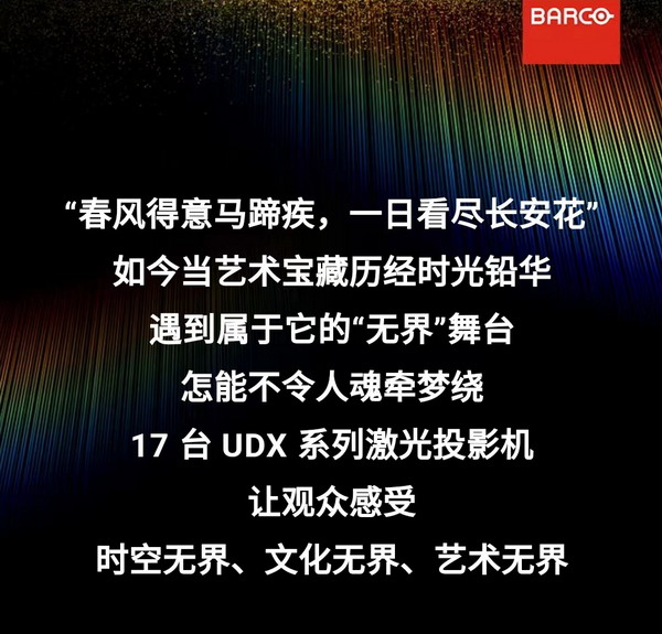 《無界·長安》精彩的演繹離不開多種技術的應用,其中投影設備需要長時間運行,狀況的良好與否直接關系到整個演出的效果。巴可 UDX 系列激光投影機采用恒定光輸出(CLO)功能可確保在長時間內保持恒定的亮度和色彩,3 片 DLP 技術、配備高對比的光學引擎,在亮度、色準和穩(wěn)定性方面表現(xiàn)出色,確保創(chuàng)意始終都能得到完美的表現(xiàn)。
