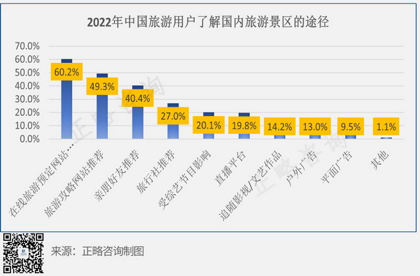 在線旅游網(wǎng)站(60.2%)和旅游網(wǎng)站攻略(49.3%)是旅游行業(yè)用戶了解國內(nèi)旅游景區(qū)的主要渠道。隨著媒體形式的快速變化,短視頻、直播等愈發(fā)受到用戶的歡迎,通過直播平臺(tái)和綜藝節(jié)目了解景區(qū)信息的用戶較之上一年也有了較大的增長。抓住OTA平臺(tái)、旅游網(wǎng)站攻略、短視頻等渠道進(jìn)行品牌傳播是營銷策略的重點(diǎn)。