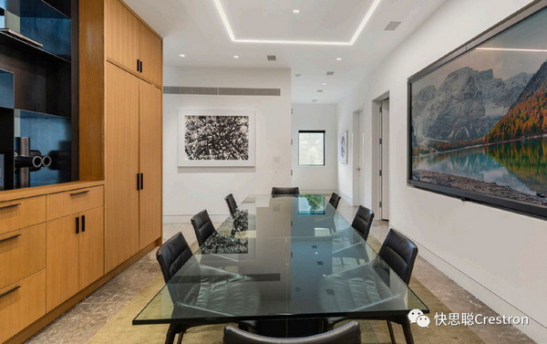 會議室是讓客戶可以進行有效會議溝通的中心。哈斯可以在這里與客戶討論設(shè)計方案或?qū)τ谡故驹陔娨晧ι系膱F隊項目就行演示及討論,所有功能都是通過快思聰?shù)目刂七M行管理的。這種卓越的集成使哈斯能夠在優(yōu)雅設(shè)計與高端技術(shù)中進行有效的協(xié)作。