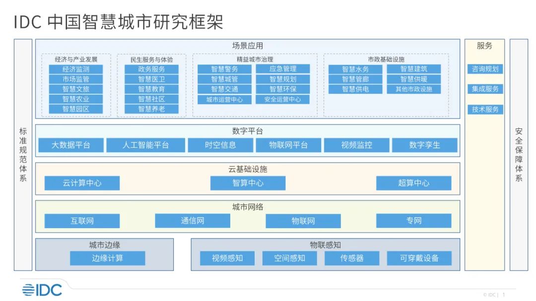 IDC中國智慧城市的研究主要包括城市場景+技術(shù)應(yīng)用的研究,場景包括經(jīng)濟(jì)與產(chǎn)業(yè)發(fā)展、民生服務(wù)與體驗、精益城市治理和市政基礎(chǔ)設(shè)施等,技術(shù)范疇包括數(shù)字平臺、云基礎(chǔ)設(shè)施、城市網(wǎng)絡(luò)、邊緣計算和物聯(lián)感知等領(lǐng)域。詳情如下: