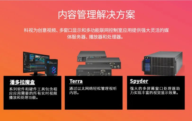 科視為創(chuàng)意視頻、多窗口顯示和多功能聯(lián)網(wǎng)控制室應(yīng)用提供強(qiáng)大靈活的媒體服務(wù)器、播放器和處理器。
