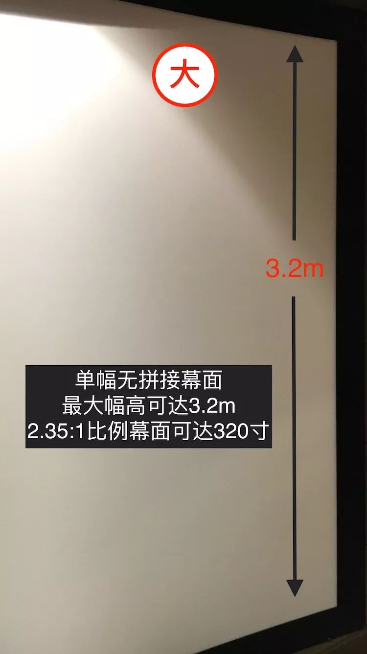 3、大尺寸:單幅無拼接幕面,最大幅高可達(dá)3.2m,2.35:1比例尺寸可達(dá)320寸;