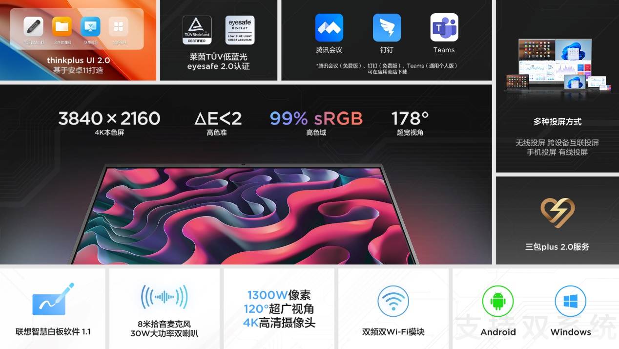 聯(lián)想thinkplus會議平板S+系列的主要賣點,均源自上一代產(chǎn)品的數(shù)千條客戶真實反饋,據(jù)thinkplus會議平板資深產(chǎn)品經(jīng)理周律表示,會議平板S+系列在全新外觀、智能交互、出色顯示、視頻會議和無線互聯(lián)五個客戶最關注的方面進行了全面升級,帶來了更智能、更高效的混合辦公體驗。