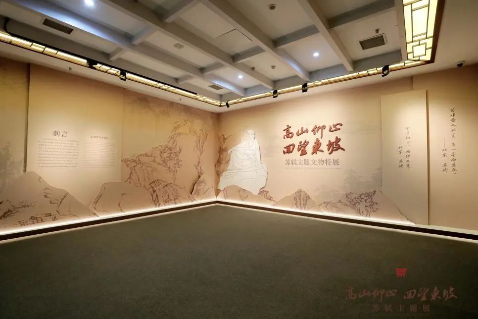 序廳是一個展覽的第一觀感,首先印入眼簾的是蘇東坡的盤陀塑像,居于版面左側,正中為立體的主標題“高山仰止 回望東坡——蘇軾主題文物特展”,右側為蘇軾的詩詞“守其初心,始終不變”“茍非吾之所有,雖一毫而莫取”,詮釋了蘇軾的人生境界。背景為起伏的山巒,前兩重為蜀山,最后一重是黃州赤壁山水,寓指四川眉州是蘇東坡的出生地,湖北黃州是蘇東坡人生的轉折點。
