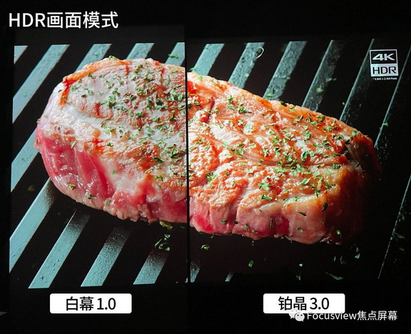 ▲HDR這項功能是可以大幅提升畫面的效果,在焦點鉑晶3.0增益幕布的加持下,我們能明顯看出HDR的畫面效果不管是從清晰度、對比度還是色彩還原上都明顯優于SDR,那么是不是只要投影機自帶HDR功能、播放了HDR的片源,無論什么屏幕都能夠對畫面做到很好的呈現呢?我們可以來做一個測試,用一塊標準的1.0增益白幕和 焦點3.0增益的鉑晶做一次對比: