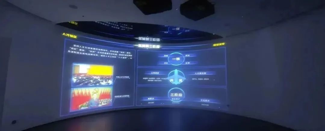 案例說明:使用9臺BC9K液晶激光投影機,通過拼接融合的方式,打造巨幅弧形畫面,讓展廳更顯沉浸感。