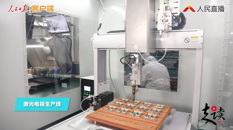來到激光電視生產車間——自動點膠、自動焊接、自動校正等工序,實現了工匠精神與智能制造的相輔相成。激光電視制造是一項精密工程,要達到8K超高分辨率顯示,光學元件往往比發絲還細,每個環節都需要精準無誤,確保4㎡百吋巨幕上的3300萬個細節都清晰可見。