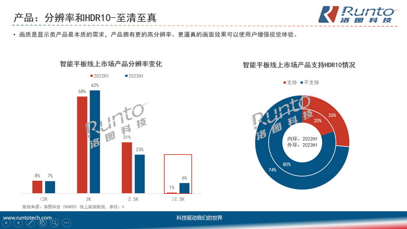 今年上半年,智能平板線上監測市場中,分辨率>2.5K的產品占比較去年同期提升了5個百分點,達到6%;顯示畫面支持HDR10的產品較去年同期增加了6個百分點,達到26%。