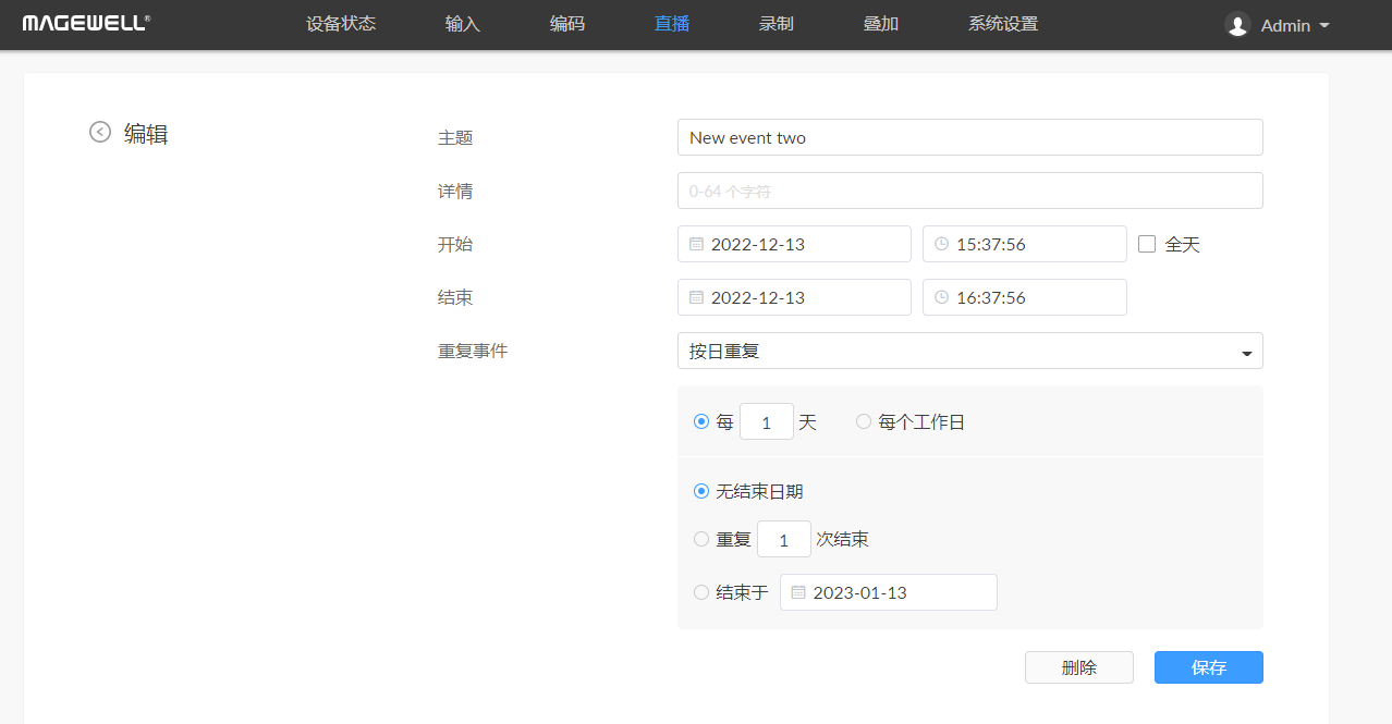 Ultra Encode AIO支持對每一路直播推流任務進行多個排程,以滿足不同用戶對于固定時間段直播推流需求。