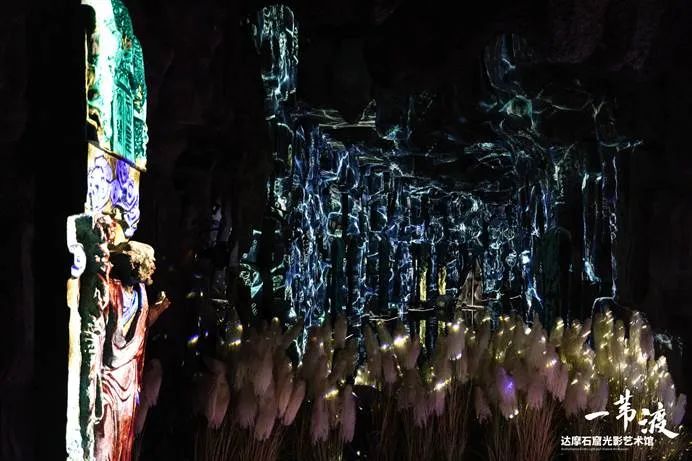 巨幅達(dá)摩呈現(xiàn)空間采用原洞窟30米挑高穹頂特點,通過“長江之水天上來”、“百態(tài)達(dá)摩洞窟幻化”、“24米數(shù)字達(dá)摩站像渡江” 三個視覺場景故事,以及裸眼3D,石窟虛擬壁畫變換等,巧妙依托石窟石壁呈現(xiàn)出了一個美輪美奐的光影視效,讓游客的視覺沉浸式體驗到達(dá)峰值。