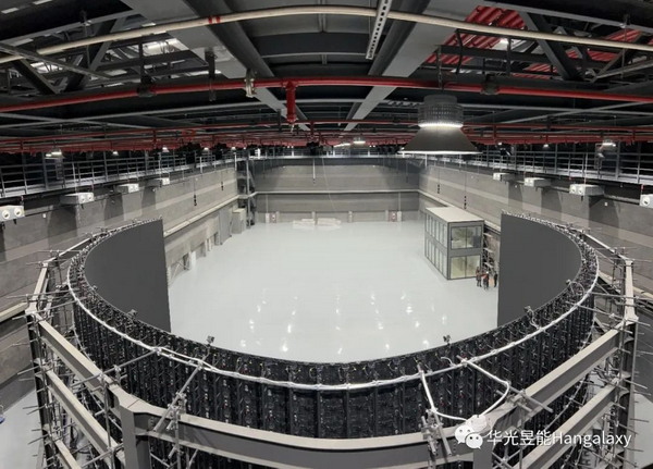 坐落在無錫國家數字電影產業園的國內最大電影級智慧虛擬攝制棚面積達3000平米,攝制棚內的中國最大圓弧廣角巨幕拍攝屏,具有超高分辨率和超廣色域,長44米,高10米,直徑23米,環幕面積440平方米。屏內配備了VP分布式計算系統、XR擴展現實及視頻播控系統、攝影機系統、跟蹤/動捕/場景掃描系統、燈光系統和整體集成調試等最高端先進的組件和IC驅動器。屏面由1760臺點間距為2.84毫米的LED箱體和遙控控制系統組成。屏幕刷新率高達7680Hz,輸出色彩深度達到了16位,分辨率高達16K*3.5K。