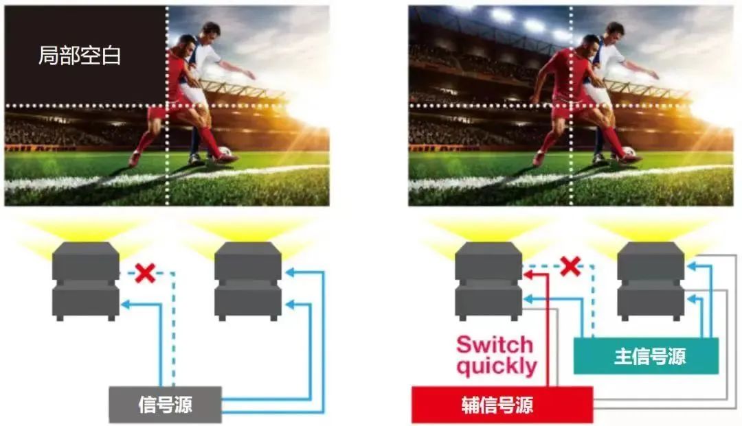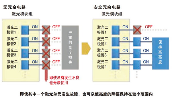 多驅(qū)動(dòng)激光光學(xué)引擎設(shè)計(jì)將激光分為多個(gè)獨(dú)立的模組,即使其中一個(gè)激光單元發(fā)生故障,展演中的畫(huà)面也不會(huì)中斷,僅亮度色彩小幅度降低;