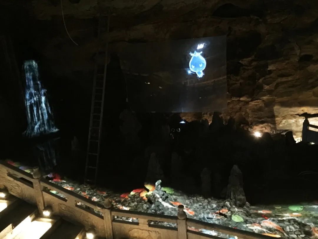 為了增加洞內游玩路線的趣味性,打造獨特的洞內游覽氛圍,景區在洞內的多處區域采用了投影的方式,在洞內的地面、洞頂、洞壁,以及特殊造型的石柱上面投映出魚戲荷塘、海底世界、瀑布流水等畫面,生動的投影內容讓平平無奇無奇的角落變得別具一格,為游客帶來更加趣味盎然的游覽體驗。