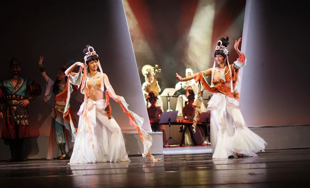 溯源敦煌文化,“活化”敦煌古樂器、古樂譜的研發成果,整臺演藝運用五弦琵琶、排簫、蓮花阮等民族樂器及敦煌仿制樂器音色,以全沉浸式的呈現方式,還原了敦煌壁畫中的樂舞盛景。此外,舞臺還加入了紗幕配合投影以營造虛實結合的豐富場景,實現恢弘影像和壯麗的舞美變換,帶來強大的視覺沖擊,增加了演員與觀眾之間的互動性和感染力。