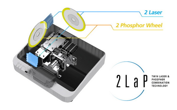 據悉,2LaP技術創造性的采用了雙激光模組、與雙熒光輪的設計。通過“雙倍”配置,熒光輪的輻照工作強度得以進一步優化,熒光粉全壽命周期長度和工況條件進一步提升,亦保障其光引擎全壽命工作在熒光粉高效率工況下,提升了激光光源的轉化利用效率。