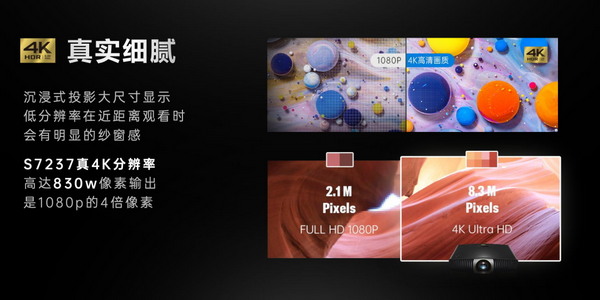 分辨率的投影在近距離觀看時會出現明顯的紗窗感,十分影響觀眾體驗。明基S7237具備真4K