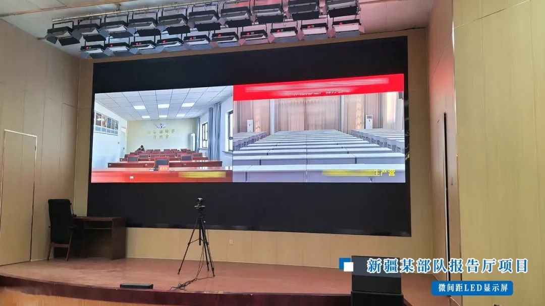 新疆某部隊報告廳近30㎡,顯示畫質清晰,高色彩還原度,高刷新,可靈活快捷切換文字、圖片、視頻等,能夠滿足宣傳展示、集體學習、培訓等多樣化需求,以更加豐富的方式展示文化內容,助力部隊開展報告、講座等豐富多彩的活動。