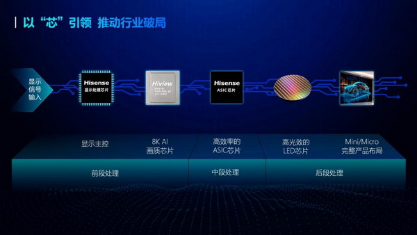 在傳統(tǒng)LED顯示行業(yè)中,顯示控制卡、驅(qū)動芯片、顯示屏各環(huán)節(jié),不同廠家分工明確,雖然可以使行業(yè)分工效率最大化,但隨著用戶對于超高清顯示畫質(zhì)的需求,對于智能化的需求越來越高,分段式的行業(yè)分工不可避免地遇到了瓶頸。作為顯示行業(yè)的“領(lǐng)頭羊”,海信從一開始便有意識的進行布局,打通產(chǎn)業(yè)鏈上的斷點,讓技術(shù)創(chuàng)新真正能夠傳遞到終端用戶,給用戶帶來價值,打造了以高畫質(zhì)、高性能、高標準、高質(zhì)量、高體驗這“五高”為核心競爭力的新一代獵影顯示技術(shù)平臺。