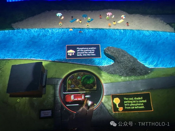 模型后面的半圓形墻面,運(yùn)用投影展示信息,投影內(nèi)容與觸摸屏聯(lián)動(dòng)。投影展示了水處理和廢物處理的流程鏈。且有助于向站在一定距離外的參觀者傳遞信息。