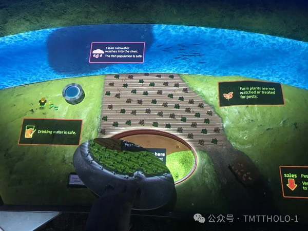 AR數(shù)字孿生系統(tǒng)與放置在轉(zhuǎn)盤(pán)上的場(chǎng)景模型,實(shí)現(xiàn)精確同步。通過(guò)觸摸屏點(diǎn)擊交互,參觀者可以旋轉(zhuǎn)模型,仔細(xì)查看廢水處理設(shè)施并了解它們的運(yùn)行方式。