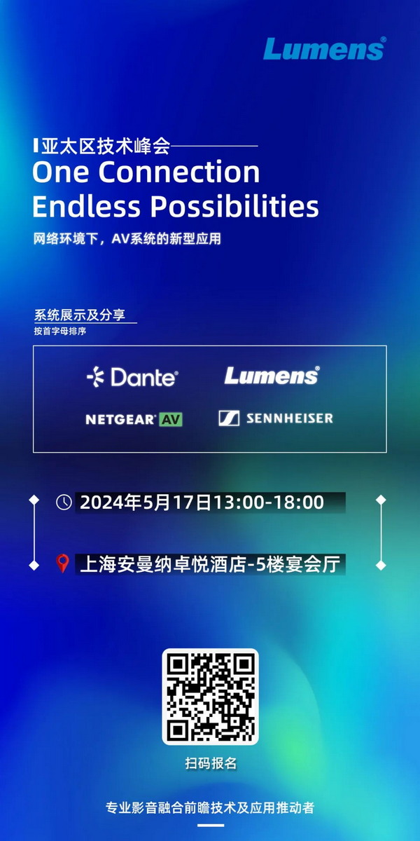 2024年5月17日,由Audinate舉辦的【Dante by Design】亞太區(qū)技術(shù)峰會(huì)將在上海安曼納卓悅酒店舉行!您在峰會(huì)現(xiàn)場(chǎng)可聆聽到用戶,技術(shù)專家及顧問(wèn)對(duì)Dante的不同使用心得、了解音視頻技術(shù)創(chuàng)新技術(shù)及發(fā)展,實(shí)現(xiàn)不同應(yīng)用領(lǐng)域的技術(shù)交流和相互學(xué)習(xí)。本次峰會(huì)Lumens受邀參加,將聯(lián)合Dante展出 BYOM音視頻融合會(huì)議解決方案,聯(lián)合SENNHEISER展出AI智能聲像追蹤解決方案。此外,本次行業(yè)峰會(huì)邀請(qǐng)眾多行業(yè)大咖,分享各自領(lǐng)域的真知灼見!