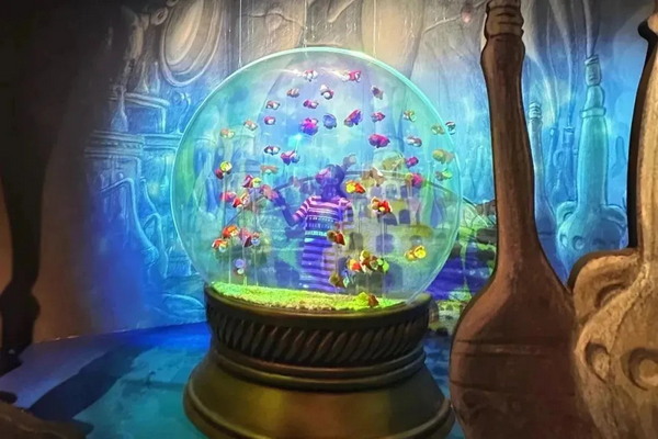 波妞的泡泡是展覽中十分吸引美拍人士的打卡地之一。它取材于宮崎駿2008年的電影《崖上的波妞》。這個(gè)看上去好似模擬海洋的巨大泡泡,是通過(guò)一臺(tái)投影機(jī)投射到半透明紗幕而形成,魚(yú)兒暢游,水波輕蕩,栩栩如生。這個(gè)海底光影世界成為觀眾最?lèi)?ài)集中逗留的地方。