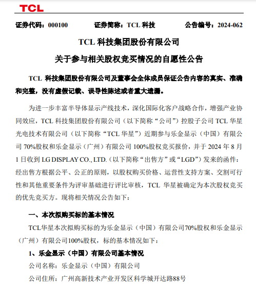 為進一步豐富半導體顯示產線技術,深化國際化客戶戰略合作,增強產業協同效應,TCL科技集團股份有限公司(以下簡稱“公司”)控股子公司TCL華星光電技術有限公司(以下簡稱“TCL華星”)近期參與樂金顯示(中國)有限公司70%股權和樂金顯示(廣州)有限公司 100%股權競買報價,并于2024年8月1日收到 LG DISPLAY CO., LTD.(以下簡稱“出售方”或“LGD”)發來的函件:經出售方根據公平、公正的原則,以股權購買價格、運營性支持方案、交割可行性和其他重要條件為評審基礎進行評比審核,TCL華星被確定為本次股權競買的優先競買方。現將相關情況公告如下: