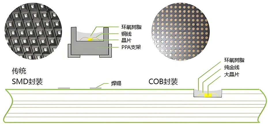 與傳統(tǒng)的SMD(表面貼裝技術(shù))封裝相比,COB封裝技術(shù)省去了燈珠的制作和焊接環(huán)節(jié),大大簡化了封裝流程。同時(shí),由于芯片直接粘附在PCB板上,散熱性能也得到了顯著提升。
