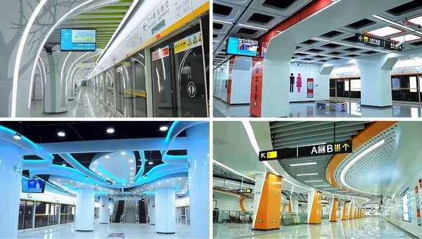 不同區(qū)域內(nèi),8號(hào)線采用的色彩體系也讓乘客眼前一亮。該方案以文字、圖片、視頻等多樣化的實(shí)時(shí)內(nèi)容展示,呈現(xiàn)“東面春之綠、南面夏之紅、西面秋之金、北面冬之藍(lán)”古典美學(xué),豐富地鐵信息內(nèi)容宣傳,同時(shí)增添藝術(shù)觀賞性與趣味性,吸引乘客駐足流連。通過(guò)搭乘地鐵,乘客不僅能享受到優(yōu)質(zhì)、高效的公共交通服務(wù),還能集中打卡無(wú)柱穹頂車(chē)站、主題文化長(zhǎng)廊等網(wǎng)紅站點(diǎn),感受靚麗城市風(fēng)采,進(jìn)一步加強(qiáng)城市文化認(rèn)同。