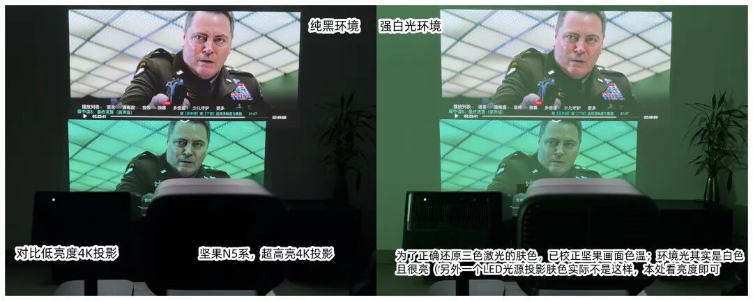 堅果N3 Pro系列我曾經夸過,白平衡處理得不錯。堅果N5系列,采用CIE170-2:2015色準標準,把色準進一步提升至ΔE≈0.7。以下是堅果N5 Ultra Max和堅果N5 Pro屏攝實拍。電視劇用的是默認的鮮艷模式,電影用的是電影模式。兩臺投影圖像膚色都是還算舒適自然,圖像細膩,未見偏色,其中堅果N5 Ultra Max整體會更明亮,高光處更透亮。不同的圖像模式和原圖對比。鮮艷模式有新亮麗之感,視覺沖擊大。標準模式和電影模式則更偏D65標準色溫,和原圖最接近,追求色準選這2個。