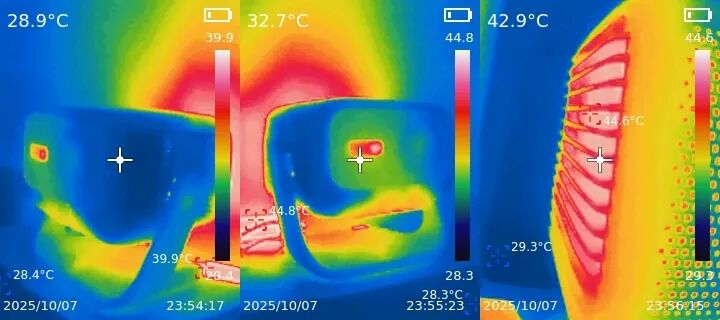 如下圖是堅果N5 Ultra Max的熱量圖。散熱口集中在背部,持續使用2小時背部外殼部分熱量約44.6度。兩側為進風口和主攝像頭部分比較低溫。持續用2-3個小時也沒有出現風扇加大和溫度爆增度情況,這個表現還是可以的。